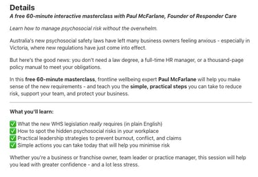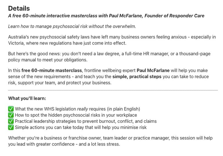 Join our FREE online masterclass to learn how to support your staff and manage the new Psychosocial WHS Legislation without feeling overwhelmed!